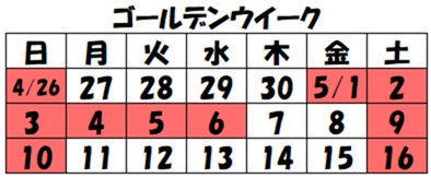 誠に勝手ながら、下記の期間をゴールデンウィーク休暇として休業いたします。